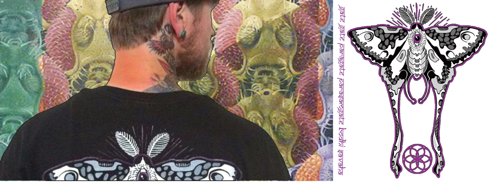 In some cultures, the moth represents the soul on its search for the light of divine truth. The Sansrikt inscription reads "Gone gone. Gone beyond. Gone beyond beyond. Hail to the goer." A blessing for those seeking truth.